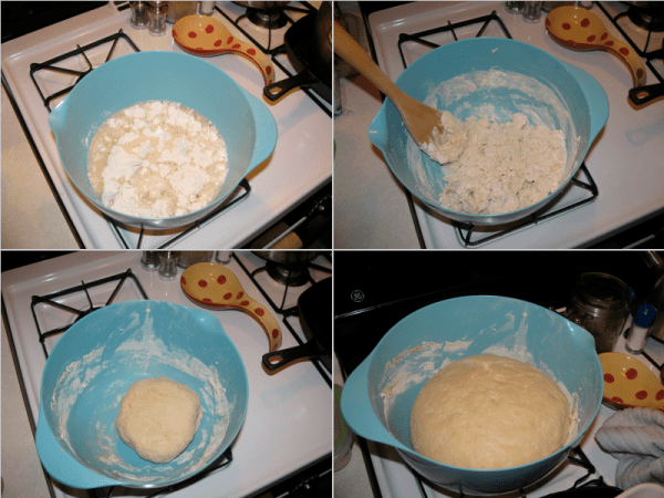Add yeast mixture to flour and incorporate using a wooden spoon.  Dough should come together in a shaggy mess.  Turn out onto a well-floured surface, gather into a ball and knead dough for about 3-5 minutes.  To knead, press the heel of your hand firmly into the dough, then fold it over and repeat. And repeat and repeat.  When kneading is finished dough should form a nice, springy ball.
