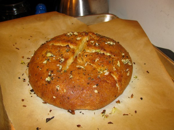 Note that I still have not, nor will I ever, let this food trend cut down on the enormous amount of Edy’s ice cream I eat.  Or the multitude of free store-bought cookies I down at my department’s daily cookie time.  We all have our limits and grad students are contractually obliged never to turn down free food.  But back to bread.  Beautiful, delicious bread with a buttery herb-filled crust.  Please, do yourself a favor and make this ‘everyday bread.’  Every day, or at least every once in a while.  The crust alone is to die for.