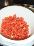 Step 5: Dice the tomatoes. Don’t worry too much about seeding them, but try not to include too many of the seeds. They should be in roughly 1/3 to 1/2 inch diced pieces. After you dice each tomato, put the pieces in a medium to large size mixing bowl. Toss them with the sugar, salt, pepper, basil, and the minced cloves of garlic – for efficiency’s sake, just mince the garlic right into the tomato mixture.