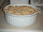 Step 8: Put the tomato and bread mixture into a 1 and 1/2 quart casserole dish. The recipe calls for a shallower dish than what Amanda used the first time, but she liked it this way, so we did it again. The mixture just managed to fit in the dish, which Amanda thinks makes it prettier on the table, but y’know. . . feel free to disagree. It’s a free country and all that jazz.