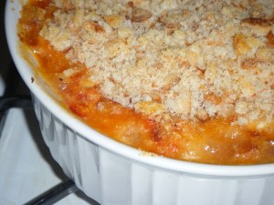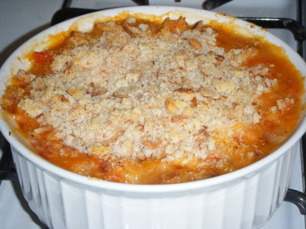 Step 9: Sprinkle the mixture with the cheese and 1/3 cup of the bread crumbs you’ve made (or of store-bought bread crumbs). The measurements here aren’t exact – just make sure the top of the dish is evenly (but not too thickly) coated with cheese and then evenly coated with bread crumbs. Feel free to nix the bread crumbs, which make for a nice crunchy top, if you just want a dish that’s completely soft in texture (it’s delicious that way, too, but Amanda likes contrast. . . )