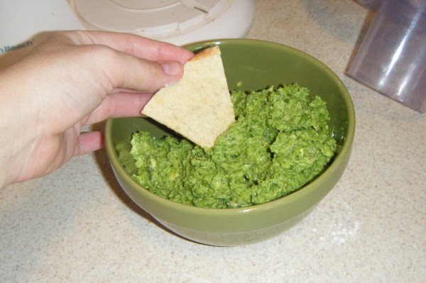 When the peas are the right temperature, throw them in the food processor with the cream cheese/cilantro/seasonings mixture and process until smooth. Put this in a bowl and serve/eat to your heart’s content. If you snack on it while cooking other things, you’ll be delighted to discover that it doesn’t turn that dark, vomitous shade of green that guacamole turns after it’s been left out too long.*