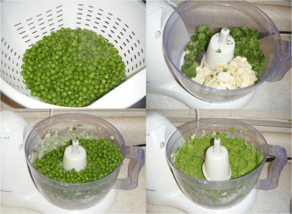 Start by preparing the peas according to the instructions on the package, preferably on the stovetop so they stay a bit more firm and don’t get overly mushy like they so often do in the microwave. While they’re steaming, pluck the cilantro leaves from the stems but don’t worry about chopping it (that’s the beauty of a food processor).