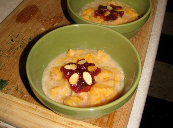 This pondering came later in life though, because as early as I can remember my cousin’s grandfather always made a proper sauce with fresh cranberries. And the cranmommies and crandaddies of the berries he uses each year must beam with pride and send their neighbors and relatives obnoxious, overly glowing Christmas letters. “BennyBerry is the highest berry on the prestigious east-facing branch and worked so hard to achieve his deep red hue that area cooks took notice!” I love Mark’s sauce and am happy to know that I’ll get to taste it again come Christmas. I have the recipe somewhere, but when Amanda and I needed an acidic red foil to the sweet flavors of our peach and yam gnocchi dish (more on that later), the recipe was nowhere to be found.