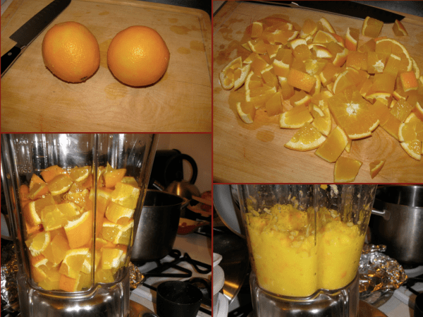 If you’re orange-averse like myself, have someone else chop up the oranges for you. Note that you should leave the peel on the oranges. That’s not a typo in the ingredient list. I’ve never peeled an orange and hope never to peel an orange, so I would never write up a recipe telling you all to do so. Finely chop oranges in a blender.