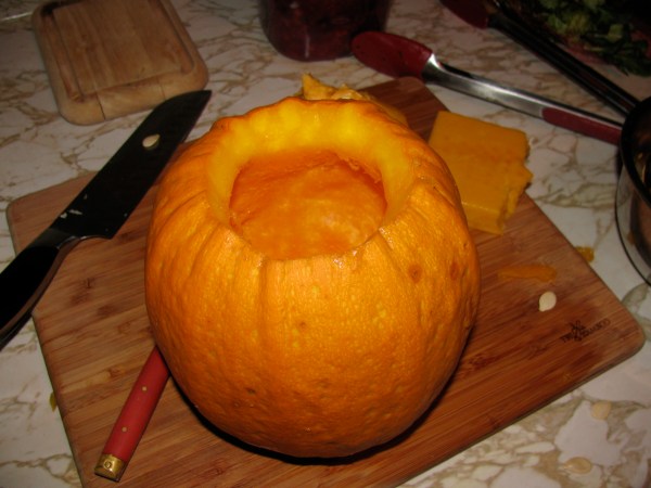 The pumpkin really does rival the turkey as a beautiful, autumnal centerpiece. Another beautiful aspect of this recipe is that it’s so simple, that you can pass it on to that relative who always wants to be of use in the kitchen, but doesn’t know a spatula from a fly swatter. Note that by writing this, I’m not implying anything about the beloved friend who Amanda and I had assemble this for our holiday, while we worked on other recipes. I’m just sayin’ though, in the future the task might fall to the brother who asked me for help with frozen pasta last night.