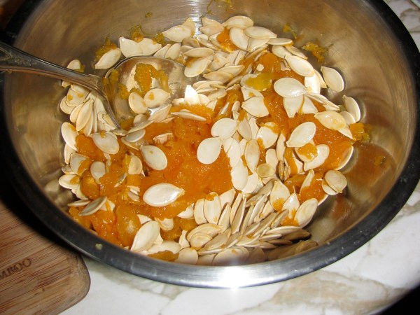 Now comes the hardest part of the recipe – cleaning out the pumpkin. There are some great jack-o-lantern tool kits made precisely for this purpose, but a spoon will do in a pinch. Attack the pumpkin with your spoon, making sure to remove all the seeds and as much of the stringy gunk as possible. I found it was best to sacrifice a little bit of the underlying pumpkin and dig the spoon into the flesh of the vegetable to eat away at the toughest patches of it’s guts. (Make sure to save the gunk – you can salvage the seeds for roasting!) Season the inside of your carved pumpkin with salt and pepper.