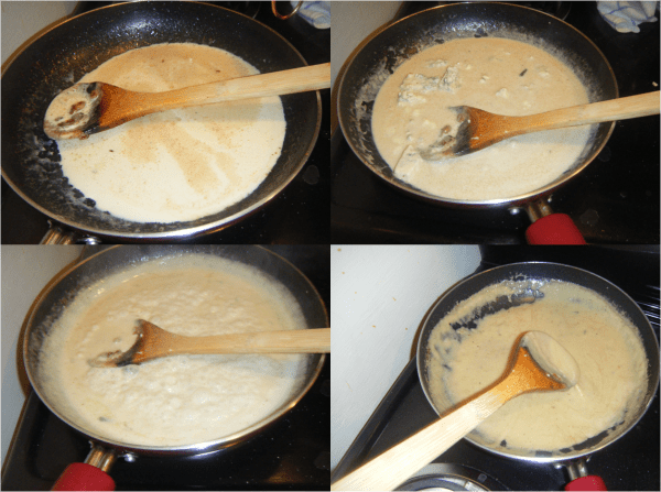 Here are some step-by-step photos of the sauce. Note that the cream doesn’t look like it’s near boil in the second photo, where the cheese has just been added. That’s because I hurriedly dumped all the cheese in, instead of gradually adding it so that the sauce wouldn’t lose its simmer. I’m not perfect.