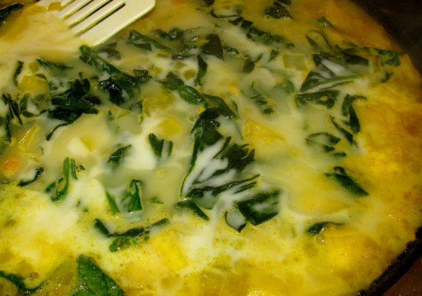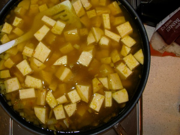 Add sweet potatoes and 5 cups vegetable broth.  Mix and bring to a simmer.  Add spinach and chickpeas and simmer for 20 minutes.  Sweet potatoes should still maintain their shape, but be very tender when poked with a fork at this point.