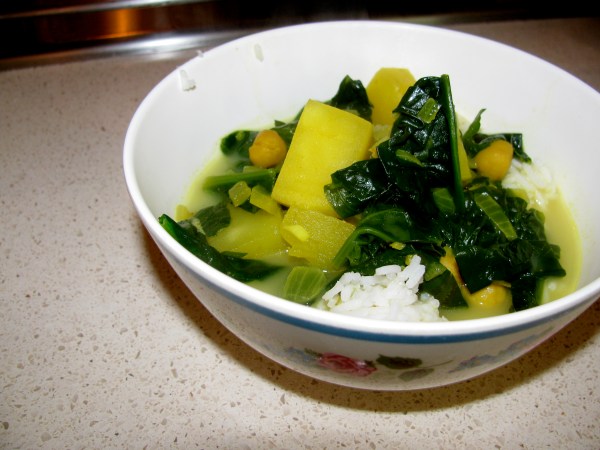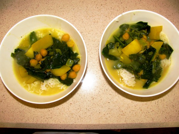 But before and after the dark weeks of science, there was cooking.  And I mean lots of cooking.  This is a recipe I fell in love with while I was still at my parent’s house earlier this month.  It’s a stew perfect for this time of year – in fact my accompanying text could have been entirely about my hatred of January sidewalk slush or the huge health benefits of a soup with greens, veggies and legumes.  But I’m much happier thinking about childhood memories of sunny park days or about the not-so-healthy cookies at home waiting to be iced.  So forget the fact that this soup matches the dismal weather or your January resolutions, and just make this because it tastes amazing.  The ginger and coconut milk give it a little kick that takes it beyond your standard-fare stew and gives you a touch of something tropical while still warming your core above freezing.  A mid-winter trip to the beaches of the South Pacific might not be feasible, but allowing your taste buds to feel like they’re on vacation somewhere with palm trees and sunshine seems like the best kind of compromise.