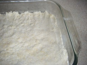 Grease a 9 x 13 pan, preferably Pyrex, and pour the mixture into the pan.  Use your fingers to pat it into an even layer.  It’ll look like it would never be an edible crust, but trust me, when the butter part melts in the oven, it will all come together.