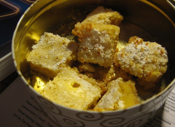 Only problem is that I, once again, forgot to take pictures of the final product before I rushed off to class.  Actually, I made these a while ago, so this was before the snickerdoodles picture failure.  Technically, this was the first “Whoops, I forgot to photograph” recipe.  Anyway, I gave some of them to the beloved carnivore and some of them to our wonderful friend Sarah who had a lot of studying to do (lemon bars are brain food, I swear).  Sarah very kindly took a few pictures for me.  Look how good they look on top of her science-y papers.