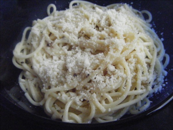 Another note – please use good Romano cheese. It needs to be very finely grated – we’re talking powder, like that Parmesan/Romano cheese you get in a plastic canister. But not that cheese. Italian cooking is all about (relatively) simple dishes with high-quality ingredients, so splurge a little bit and get the good stuff. This is still a cheap dinner. The best cheese to use is the kind that’s been freshly grated by the store – so it’s not a “brand” cheese but comes in a little plastic container with the weight, the price per pound, and the price printed on it. Or the block of Pecorino Romano, but that’s usually quite hard to find. The very best cheese is the Pecorino Pepato, which has peppecorns in the cheese (oh my gosh, so tasty) – but you usually can only find this at a specialty cheese store or at a place like Whole Foods.