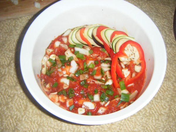 Prepare your vegetables.   Peel and thinly slice your garlic cloves.   Chop your onion into a half-inch dice, and finely dice your half-bunch of green onion (if using).  Now slice the rest of your vegetables into 1/8 inch slices – this is much easier with a mandoline, but it’s definitely doable with just a good knife.  And if you have a mandoline, and if you’re like me, you may find it impossible to slice the eggplant without it gumming up on the blade, so you may want to resort to a sharp knife.  Set your vegetables aside.
