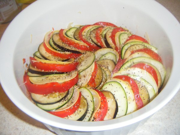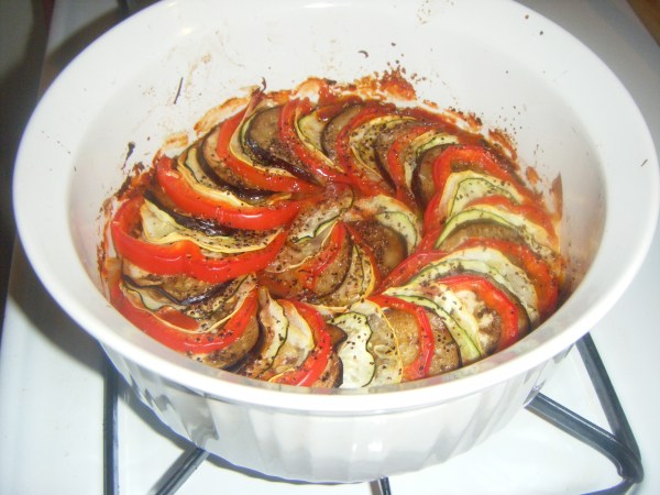 Also, you will likely have extra vegetable slices – though you may run out of red pepper.  Just save them and make another batch of ratatouille the next day, or find another creative use for them (Em’s better at that part than I am, so she’d have better ideas than I do).