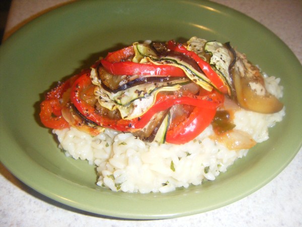 The beloved carnivore loves ratatouille – he loves it so much that he got a mandoline for me after I told him pointedly (several times) that it would make it much easier for me to make ratatouille for him.  The fact that he loves ratatouille so much thrills me – because it’s pretty healthy, especially if you serve it over a bed of rice or some other healthy grain.
