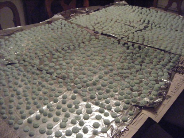 I made eight batches, and it took me about six hours total, but in my not-so-unbiased opinion, they’re pretty darn tasty and a lot yummier than the wedding mints you can buy online these days.  In fact, I made them exactly three weeks ago today, and I just ate one while I was taking these photos.  They were harder than they had been on the day of our wedding, but still tasty.  I can’t, however, make any claims about whether or not the FDA would approve of consuming these mints so long after making them.