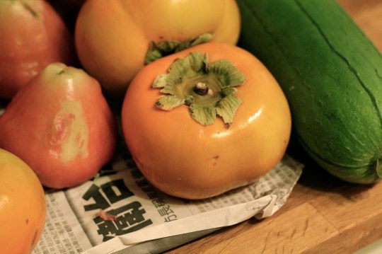 Note: This recipe uses Fuyu persimmons, which are the harder, squatter ones. Fuyu persimmons are a little like spicy apples, while Hachiya persimmons are a lot juicier and might require some manipulating to use in this recipe.