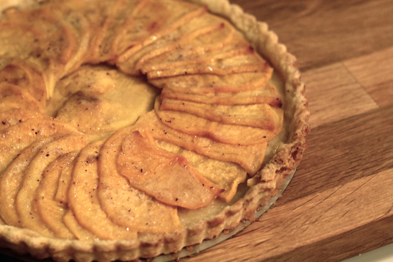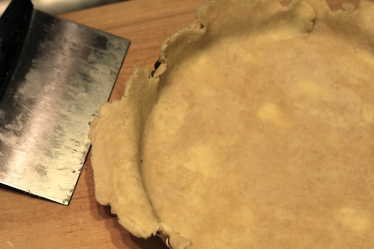 Assemble tart: Preheat oven to 375˚F. On a lightly floured surface, roll out dough into a 13-inch round and fit into a 10-inch tart tin. Press dough into corners and then guide your rolling pin across the edges of the tart pan to trim the excess dough.