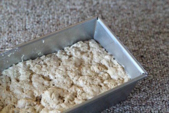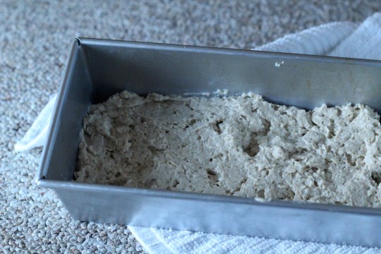 Brush an 8-cup loaf pan with melted butter or oil. Turn the dough out into the tin, cover with a clean towel and set in a warm place. Let rise for 30 minutes (or an hour in a colder kitchen).