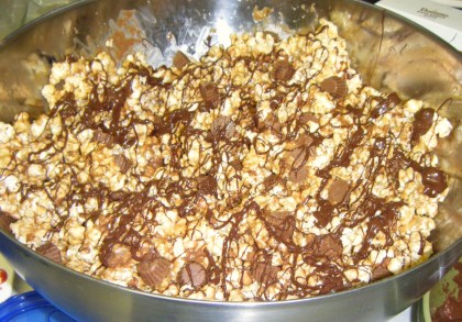 Wait five to ten minutes, letting the popcorn cool a bit. Add in the mini-Reese’s cups and stir until the mini-Reese’s cups are evenly distributed through the popcorn. Again, this will probably take a few minutes, but work as quickly as you can, so that the Reese’s cups don’t melt too much.