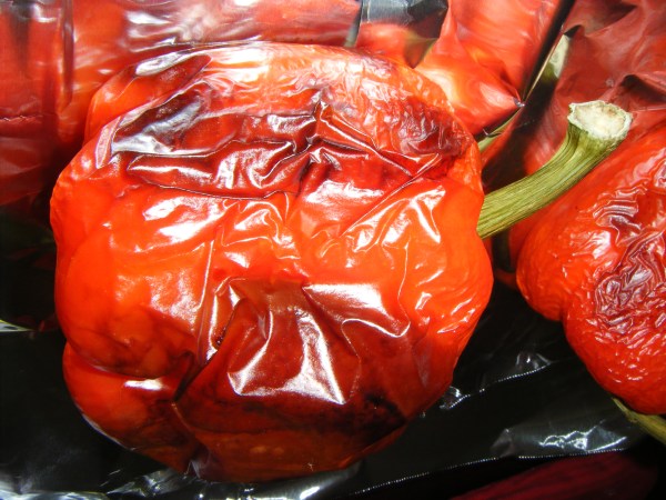 Because I never buy roasted red peppers, I almost always use the Smitten Kitchen method for roasting red peppers.  Preheat your oven to 350 degrees.  Line a pan with aluminum foil.  Placed washed red peppers on the foil and place in the preheated oven.  Cook for one hour, using tongs to give the red peppers a quarter turn every fifteen minutes.  The red peppers will be blackened and blistery and smell delicious.