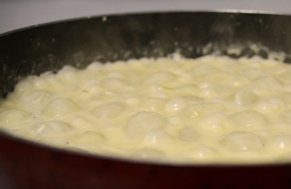 In a large saucepan over medium heat, heat the olive oil and butter until the butter is melted. Add in the cream, cheese, nutmeg, salt, and pepper. Stir until completely smooth and reduce to medium-low heat. It’s very important not to use too much heat, because then you run the risk of the alfredo separating, which I’ve learned the hard way more than once. Stir occasionally. After five minutes or so, the sauce should have started to thicken. Add in the pearl onions and brandy (if using) and stir well. Cover the pan most of the way, but not completely.