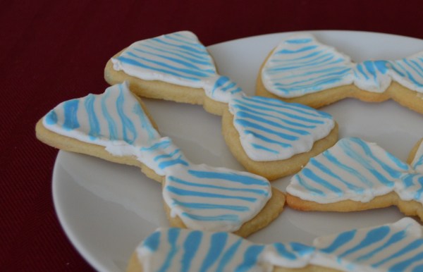 The groom is a big bowtie fan, and I’d actually meant to make him bowtie cookies for his birthday last fall, but work got away from me, so I figured that I’d make up for it by sending my husband down to the bachelor party with a box full of bowtie cookies. There’s something extra fun to me about finding a cookie cutter that suits a person’s personality – probably because one year, I think for Christmas, my mom got us all cookie cutters that matched our personality. Mine was a foot, because I *hate* shoes and walk around barefoot as much as possible when home.