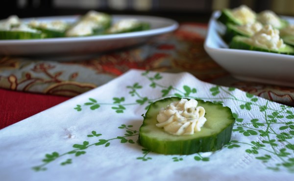 Boursin cheese was on sale, so I thought I’d try these little cucumber bites filled with a Boursin-based filling. However, recognizing that Boursin is rarely on sale at my grocery store and is not budget-friendly when it’s not on sale, I also tried making a filling with the more budget-friendly and more frequently on-sale Laughing Cow blue cheese. It worked very well, and I think you could use any Laughing Cow or similar flavored cheese that you like. The one down side of Laughing Cow cheese is that you have to unwrap each individual wedge, but that doesn’t take all that much time.